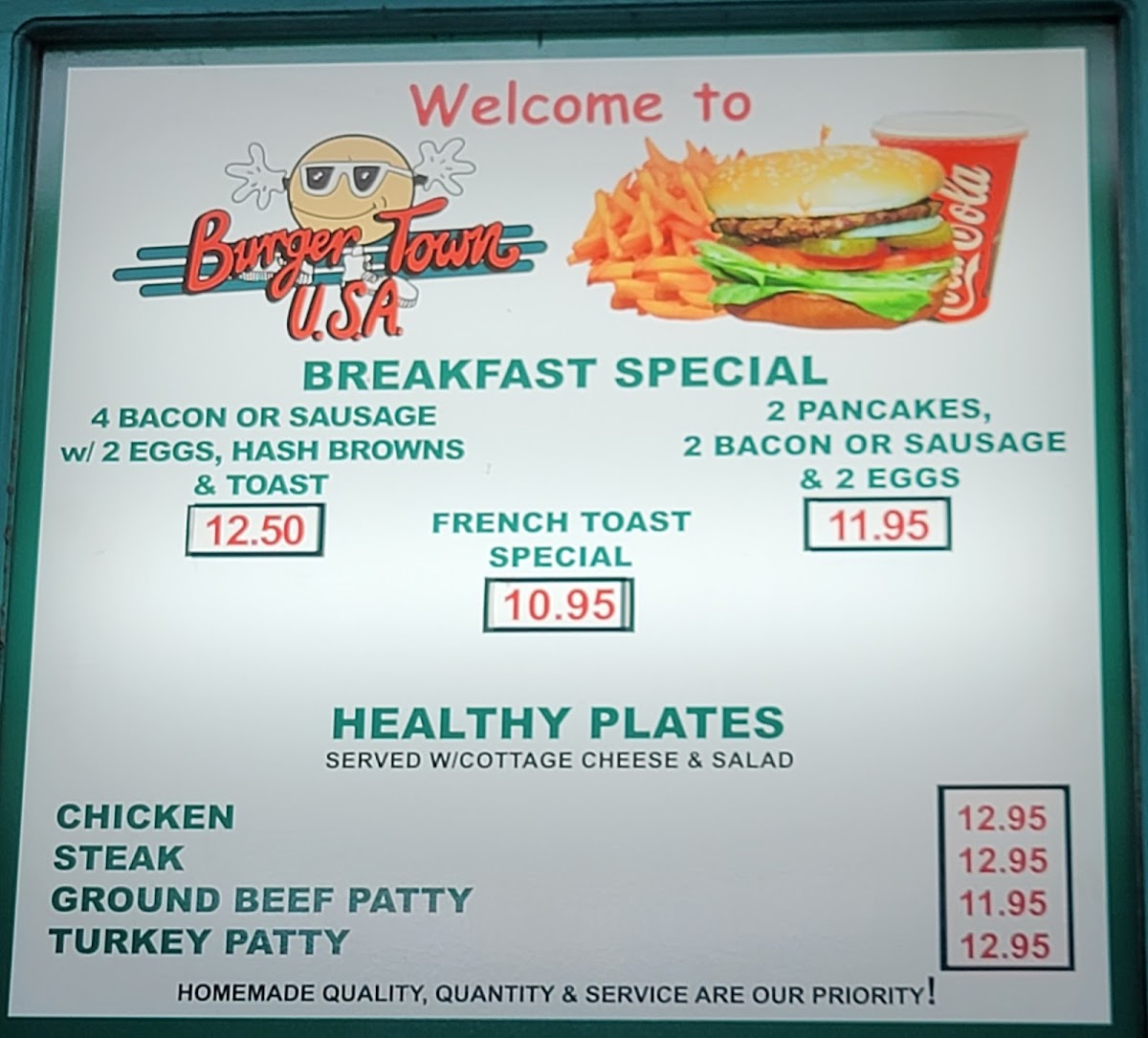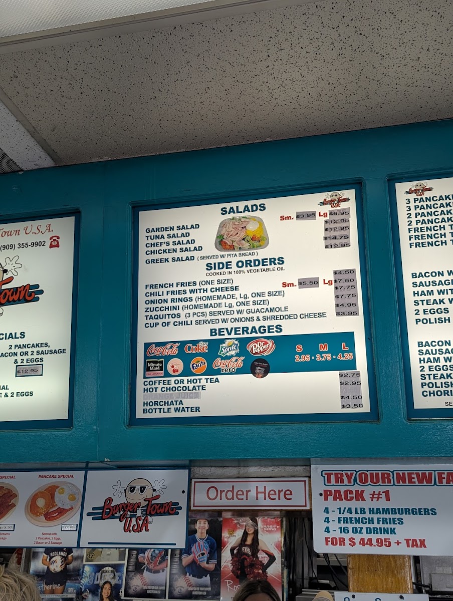 The menu at Burgertown USA features a variety of classic American fast food and breakfast options, organized into distinct groups to suit different meal occasions. Visitors can choose from a range of beverages that include hot chocolate, horchata, and bottled water.