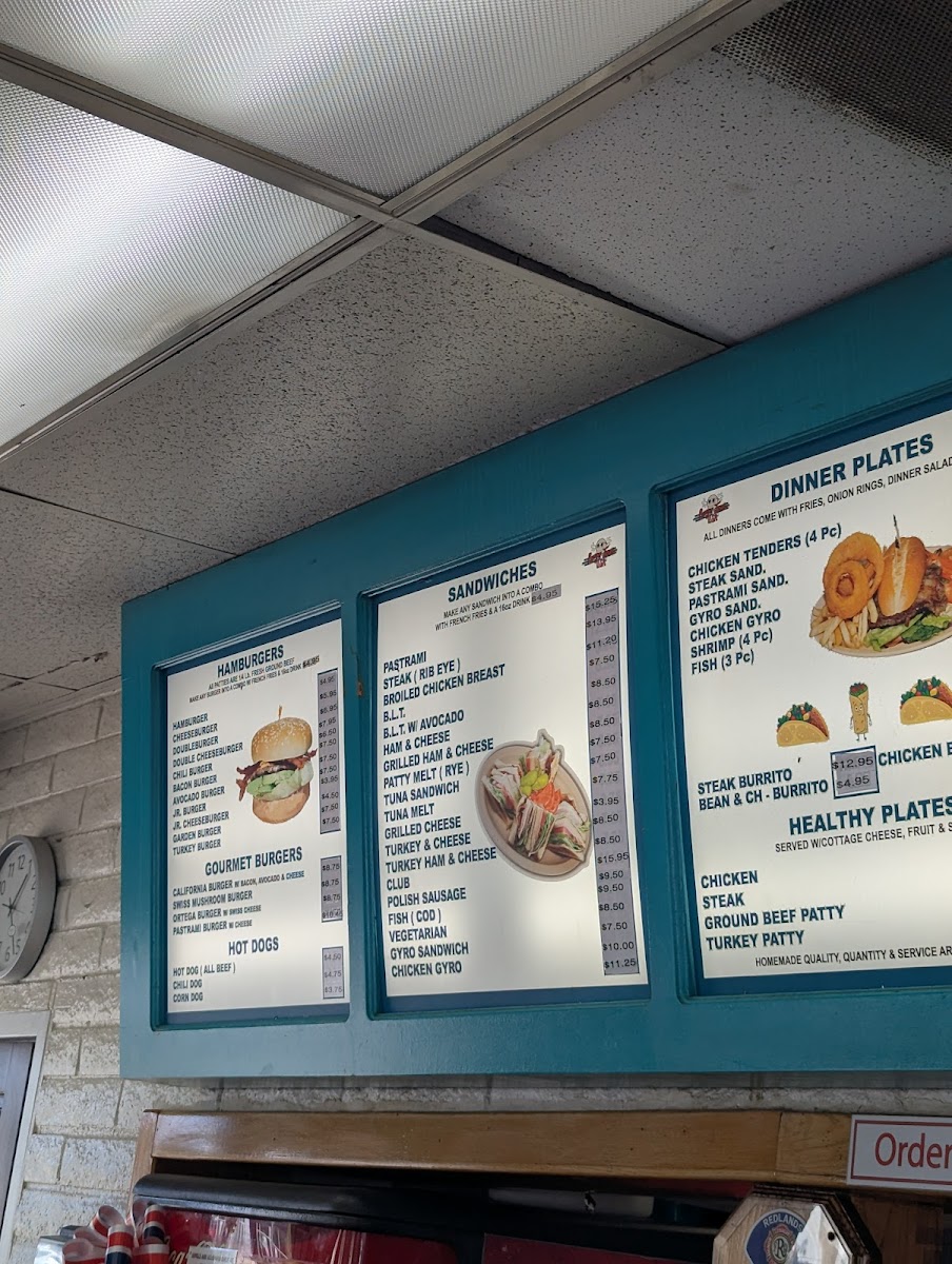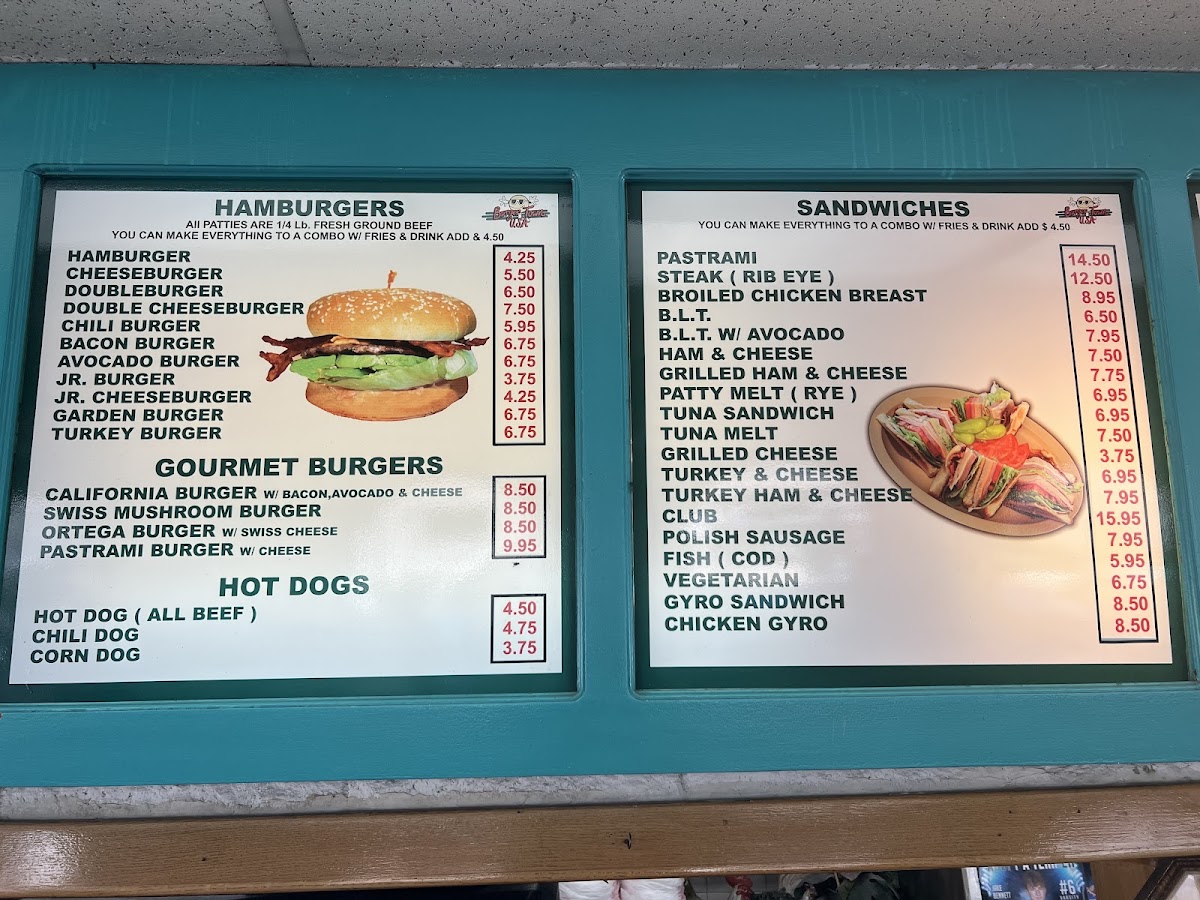 Main food items focus on hamburger varieties, including specialty burgers such as the Mushroom Swiss Burger, California Burger, and Ortega Burger. Accompanying sides include popular fast food choices like French fries, chili fries with cheese, onion rings, and zucchini fries or fried zucchini sticks. The menu also offers sandwiches like the Club Sandwich and gyros, accompanied by condiments like tzatziki sauce.