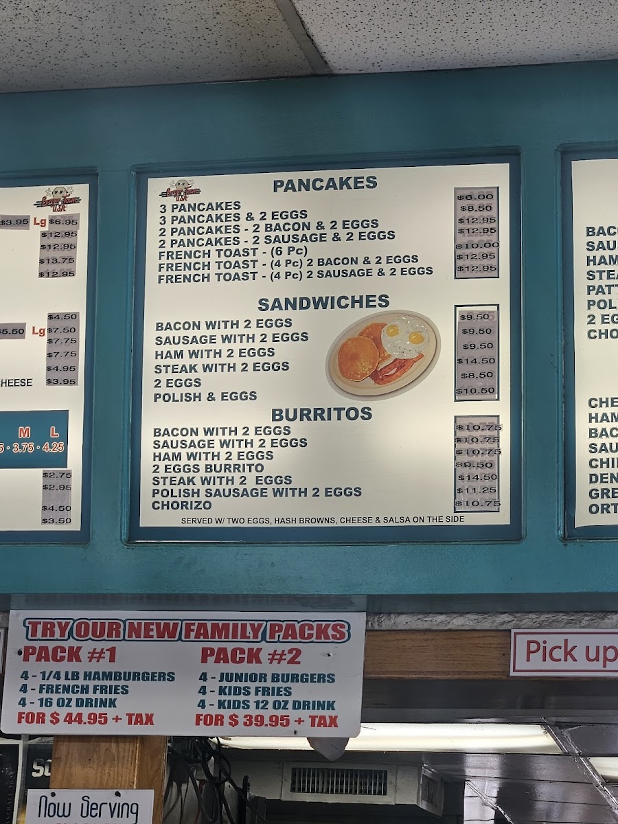 Breakfast offerings include several pancake options such as 2 or 3 pancakes served with eggs, bacon, or sausage, as well as French toast available in multiple combinations with eggs and meat. There are also breakfast specials like the French Toast Special and ham and cheese omelette, catering to early-day meals.